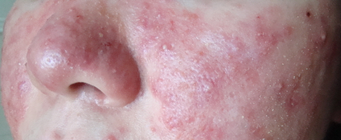 이런 형태의 주사는 얼핏 보면 여드름이나 모낭염처럼 보이기도 합니다. 물론 모낭염이나 여드름이 주사, 주사 피부염이 동반되기도 합니다.