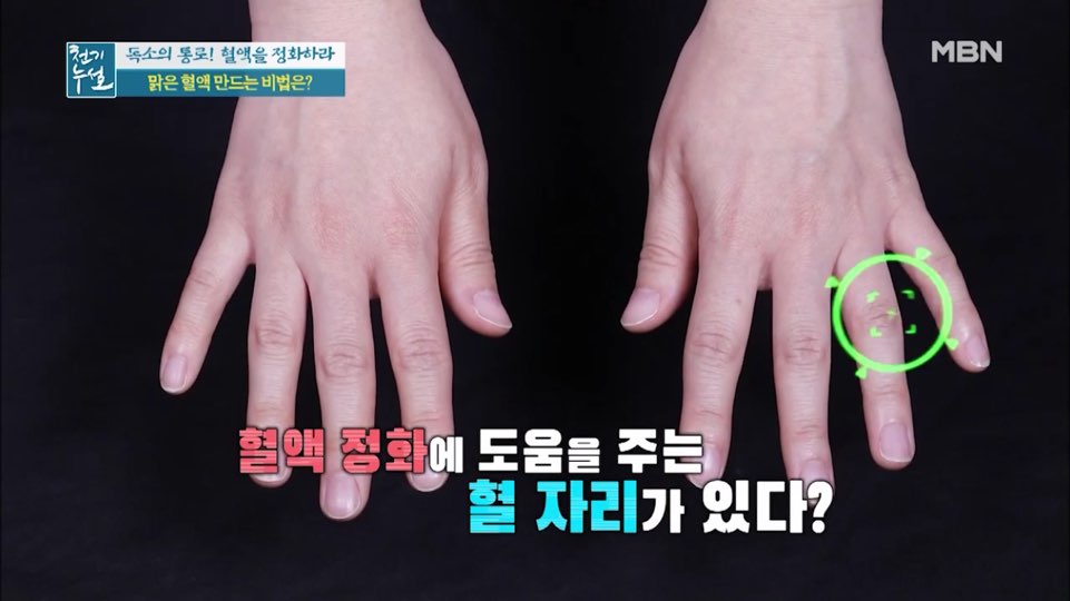 우리 손에 있는 청혈 스위치를 눌러주는 것인데요. 더러워진 혈액 속 독소를 빼는 데 도움을 주는 혈 자리, 바로 소상혈입니다.