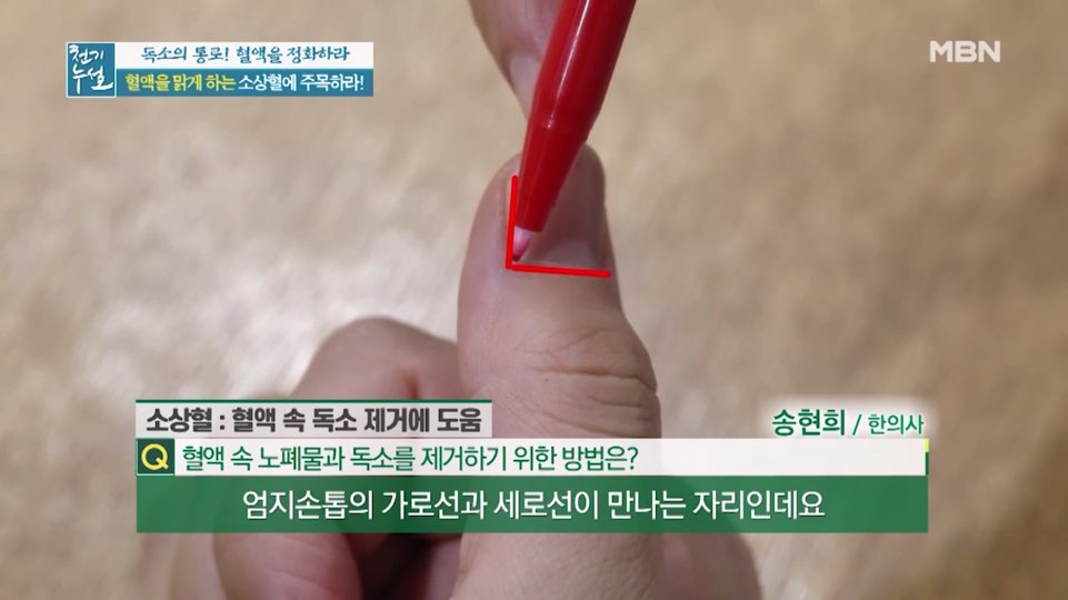 따라서 엄지손가락 끝에 있는 소상혈을 자극해주면 기혈 순환을 도와 혈액을 맑고 건강하게 해준다고 합니다.