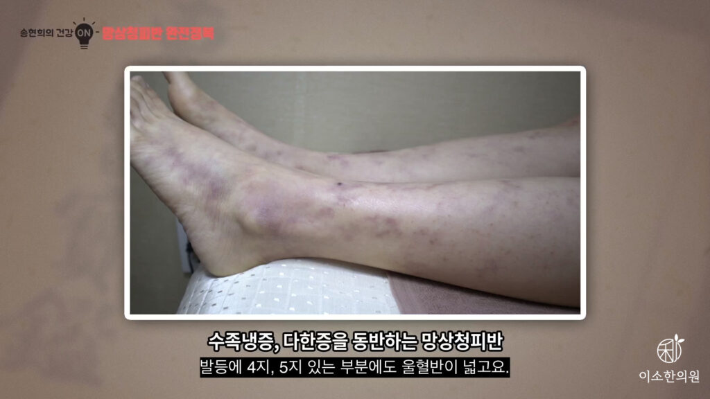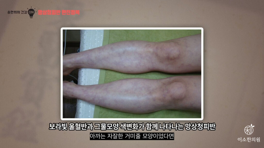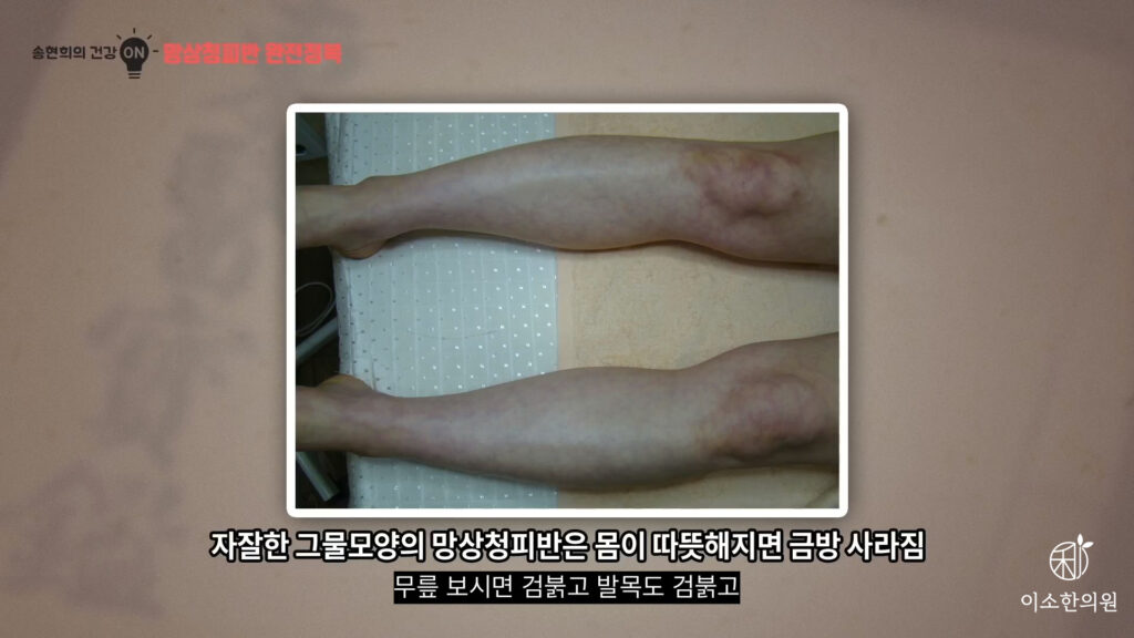 첫 번째 사진은 자잘한 거미줄 모양의 망상청피반이라면 이 사진은 중간 중간에 큰 울혈이 나타나는 게 정강이, 무릎 주변에 보이실 겁니다. 그 사이에 색깔은 연하지만 자잘한 그물모양이 나타납니다.
