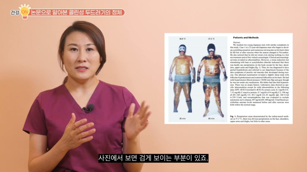 콜린성 두드러기가 땀이 안 나는 부위와 연관성이 있다는 것, 무한증이 콜린성 두드러기와 연관이 있다는 것을 보여주는 실험이었습니다.