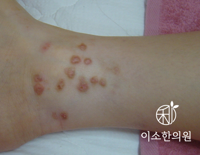 구진 양상의 양진 부위를 긁고 진물이 나고 환부가 합쳐지면서 화폐상 습진처럼 넓어질 수 있습니다. 자신도 모르게 손이 가고 스쳐서 진물이 난다면 2차 감염으로 가지 않도록 해야 합니다.