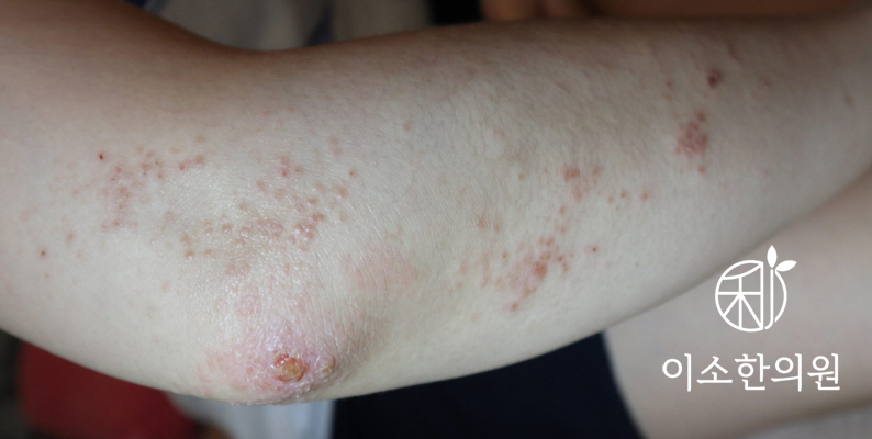 아토피 피부염은 대칭적으로 생깁니다. 예를 들어 왼쪽 오금에 생기면 오른쪽 오금에도 생기는 식이죠.