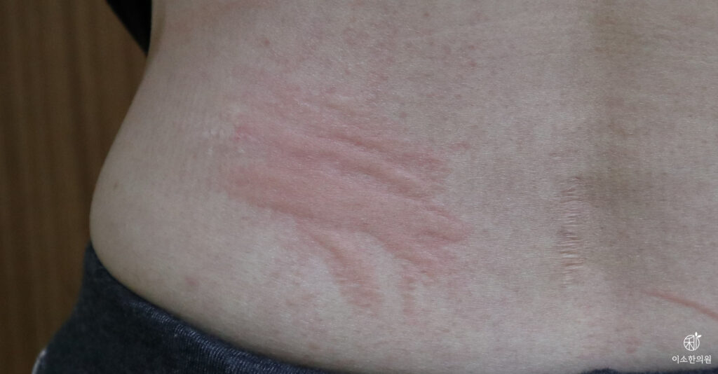 긁거나 혹은 물리적인 자극이 가해지면 피부가 부풀면서 가렵죠. 또 주변이 가려워져서 긁게 됩니다. 자극 때문에 가려운 것이 피부묘기증 두드러기 패턴입니다.