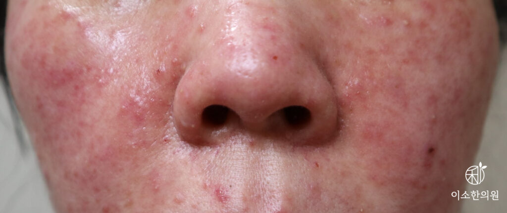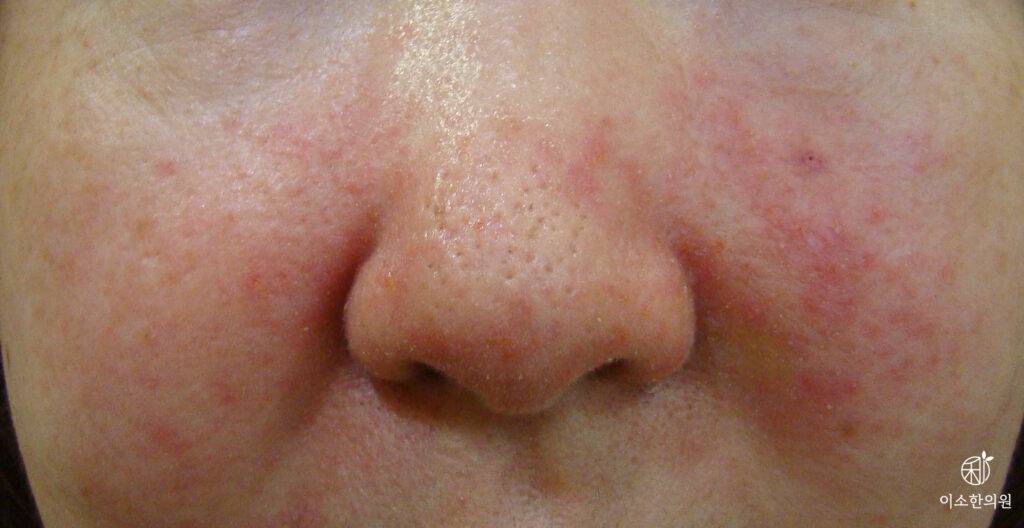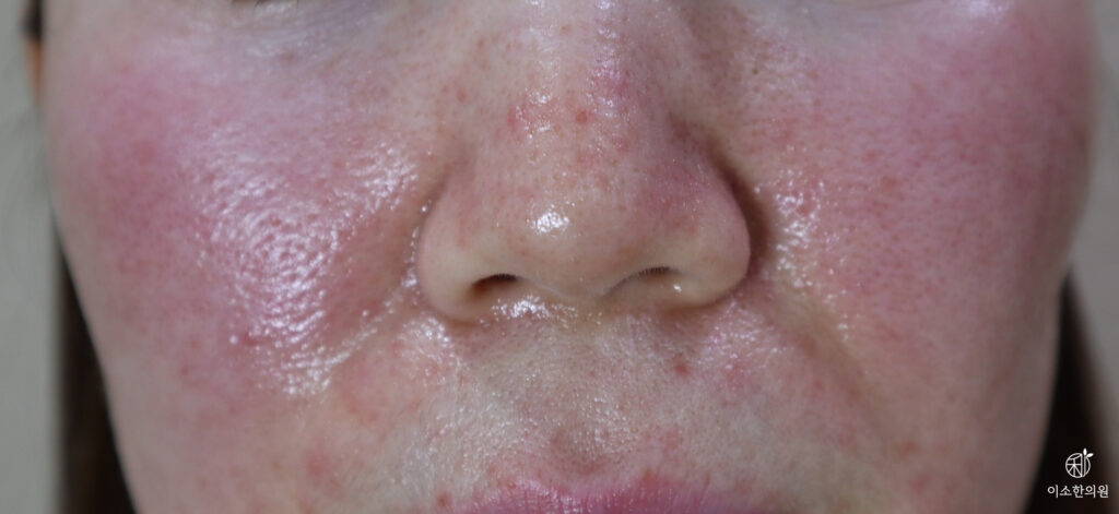 ์ฐ์ ์ฃผ์ฌํผ๋ถ์ผ์ ํผํ, ํผ๋ถ๋ฐ์ ํ๊ด์ ์ถฉํ, ์ผ์ฆ์ผ๋ก ๋ฐ๋ณํ๊ณ ํ์กฐ๋ก ์์ํ๋ ๋ง์ฑ ์ถฉํ์ฑ, ์ผ์ฆ์ฑ ์งํ์ ๋๋ค. ๊ทธ๋์ ์ผ๊ตด์ ์ค์ฌ๋ถ์ธ ์ฝ ์ฃผ๋ณ๋ถํฐ ์ธ๊ณฝ ๋ผ์ธ์ผ๋ก ์ ์ ํ์กฐ๊ฐ ๋ฒ์ด์ง์ฃ . ๊ทธ๋ฆฌ๊ณ ํ์กฐ์ ๋ฒ์๊ฐ ๋์ด์ง๋๋ค. ์ฌํ๋ฉด ๋พฐ๋ฃจ์ง, ๋ํฌ๊ฐ ์๊ธฐ๊ธฐ๋ ํฉ๋๋ค.