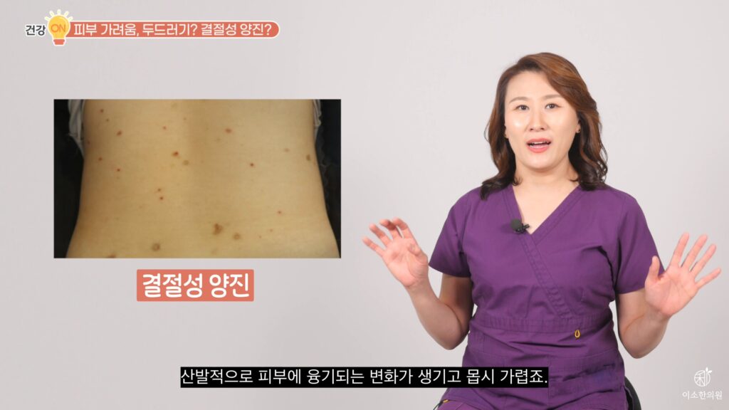 오돌토돌하게 땀띠보다 조금 큰 크기로 산발적으로 피부에 융기되는 변화가 생기고 몹시 가렵죠. 결절성 양진이라고 해서 융기되는 환부가 딱딱하게 콩알처럼 변하는 경우도 있습니다.
