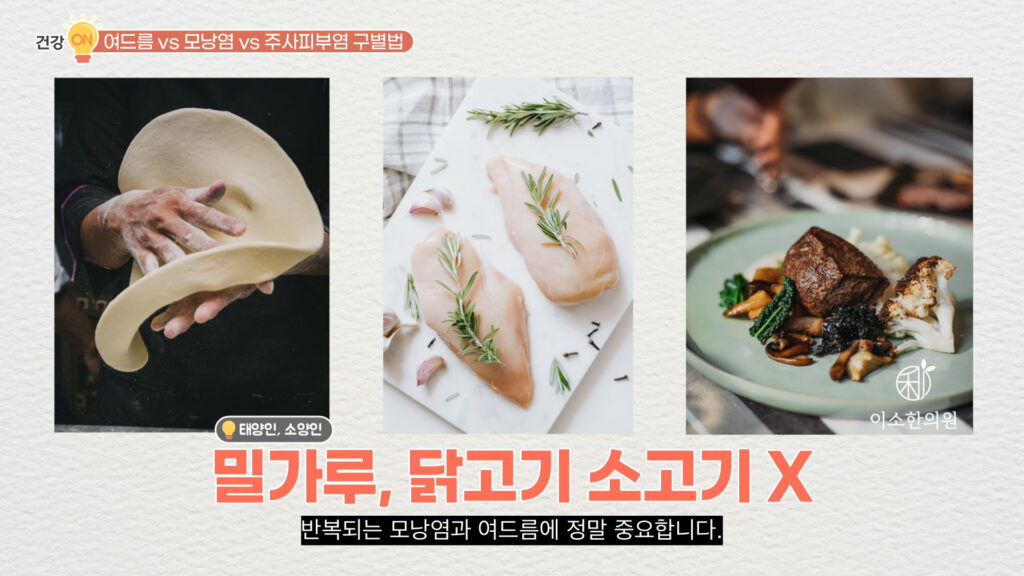 반복되는 여드름, 모낭염이라면 두 가지가 중요합니다. 한 가지는 식이 관리 두 번째는 피부 장벽을 튼튼히 하는 것입니다. 이런 경우 체질 감별이 정말 중요합니다. 태음인, 소음인이라면 돼지고기, 기름진 음식, 카페인 먹지 않는 습관 필요하고요. 태양인 소양인이라면 밀가루, 닭고기, 소고기 피하기가 반복되는 모낭염, 여드름에 정말 중요합니다.