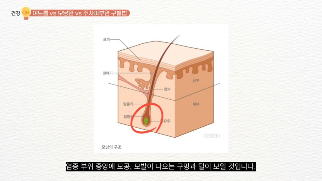 여드름보다 아프거나 가려운 느낌이 좀 더 있다는 것이 여드름과 모낭염의 감별점입니다.