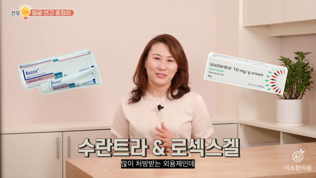그다음 같이 묶을 수 있는 외용제는 수란트라, 로섹스겔이 있습니다. 얼굴 피부 질환 환자가 주사 피부염이라고 진단받을 때 많이 처방받는 외용제입니다. 모낭염을 완화시키며 모낭충의 번식을 해결하는 약물이기 때문에 리바운드 현상에 대한 부작용은 비교적 안전합니다,