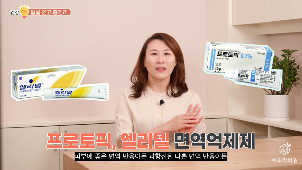또 리바운드 반동 현상이 일어날 수 있는 대표적인 면역 억제제는 프로토픽, 엘리델입니다. 피부에 좋은 면역 반응이든 과항진 된 나쁜 면역 반응이든 모두 이렇게 누르고 억제해서 우선 증상 진정시키는 연고이기 때문에 당연히 끊으면 억제되었던 증상들이 뻥하고 튀는 리바운드 올 수 있습니다.