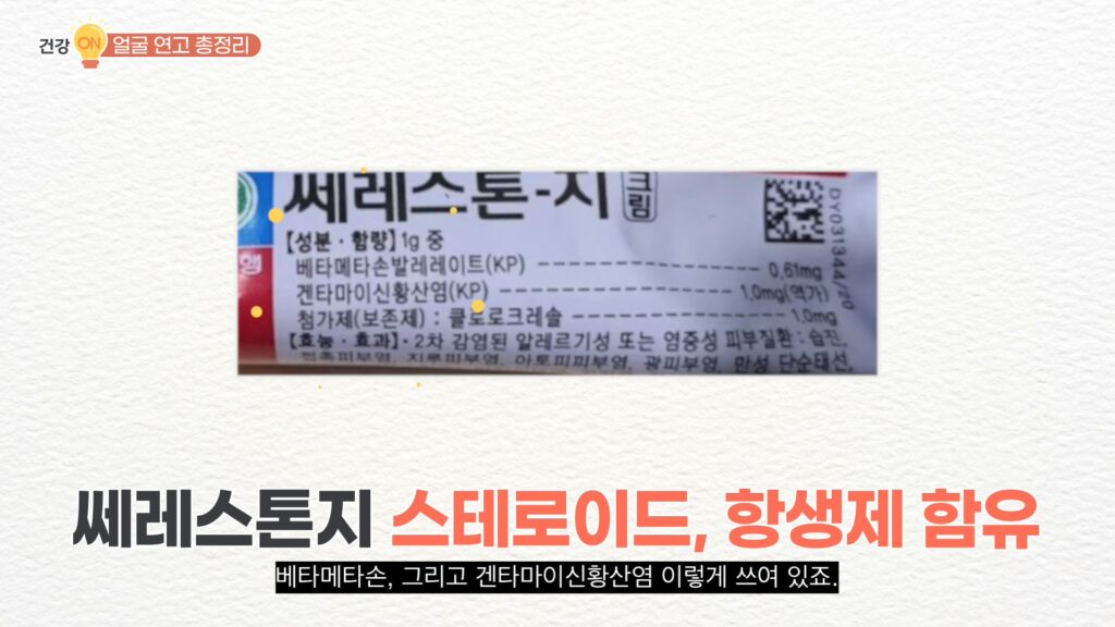 당연히 안 됩니다. 연고 오남용으로 내원하신 분들이 사용하는 대표적인 연고가 바로 쎄레스톤지입니다. 쎄레스톤지 성분을 보면 베타메타손 그리고 겐타마이신 황산염이라고 쓰여 있습니다.