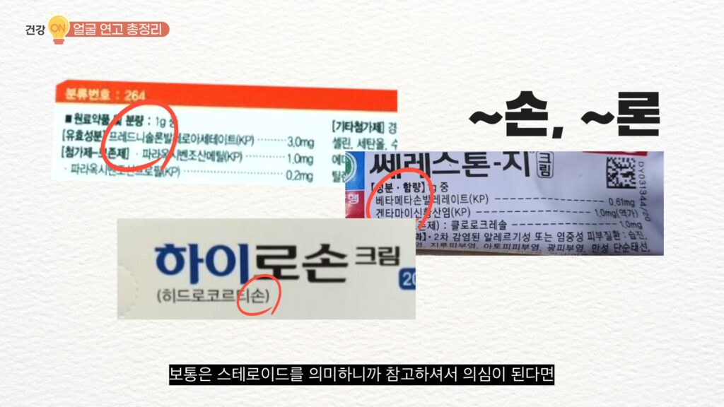 우리가 스테로이드 오래 쓰면 안 되는 것을 알고는 있지만 실제 외용제의 성분명에 스테로이드라고 적혀 있진 않습니다. 프레드니솔론, 베타메타손 혹은 히드로코트리손 등 ~손, ~론 으로 끝나면 보통은 스테로이드를 의미하니까 의심이 된다면 꼭 한번 검색한 후에 사용해보기를 권해드립니다.