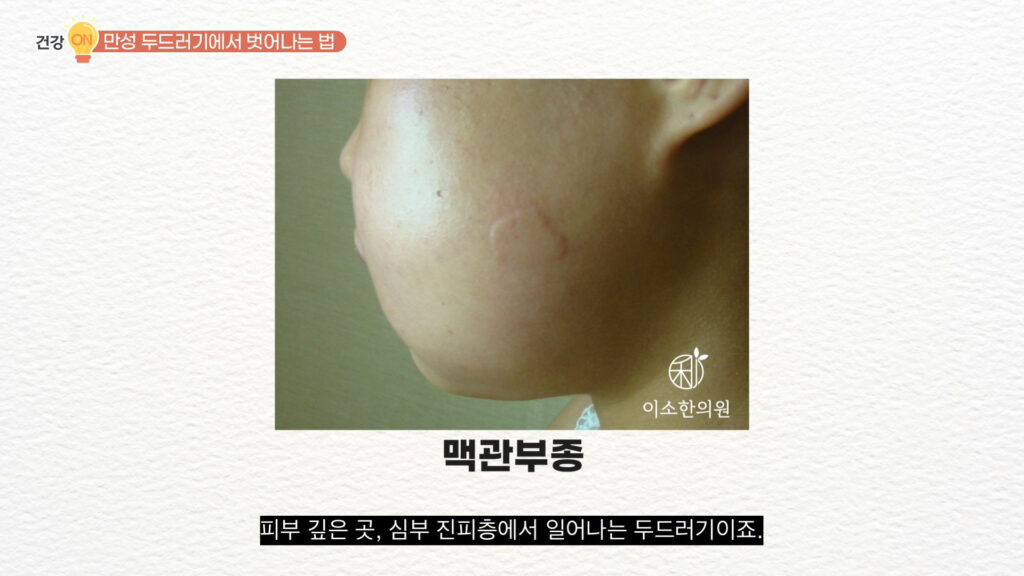 마지막 세 번째로 입술이 붓거나 눈이 붓거나 턱이 붓거나 하는 혈관부종, 맥관부종이 3회 이상 반복되는 경우 만성두드러기로 이어질 가능성이 높습니다.