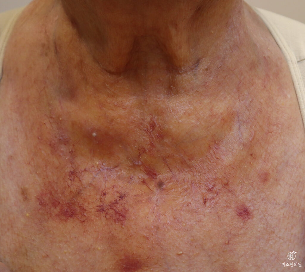 노인성 자반 환자분들 이야기를 들어보면 “장바구니만 들었는데 손등, 팔에 혈관이 터졌다.”, “샤워하면서 타월로 슬쩍 문질렀는데 목에 얼굴에 자반이 생겼다.”, “옷깃에 스치기만 했는데 손등이 터졌다.” 이렇게 표현합니다. 얼굴, 목 등 잘 보이는 부위에 자반이 생기니 보기에도 좋지 않고 신경이 많이 쓰일 것입니다.