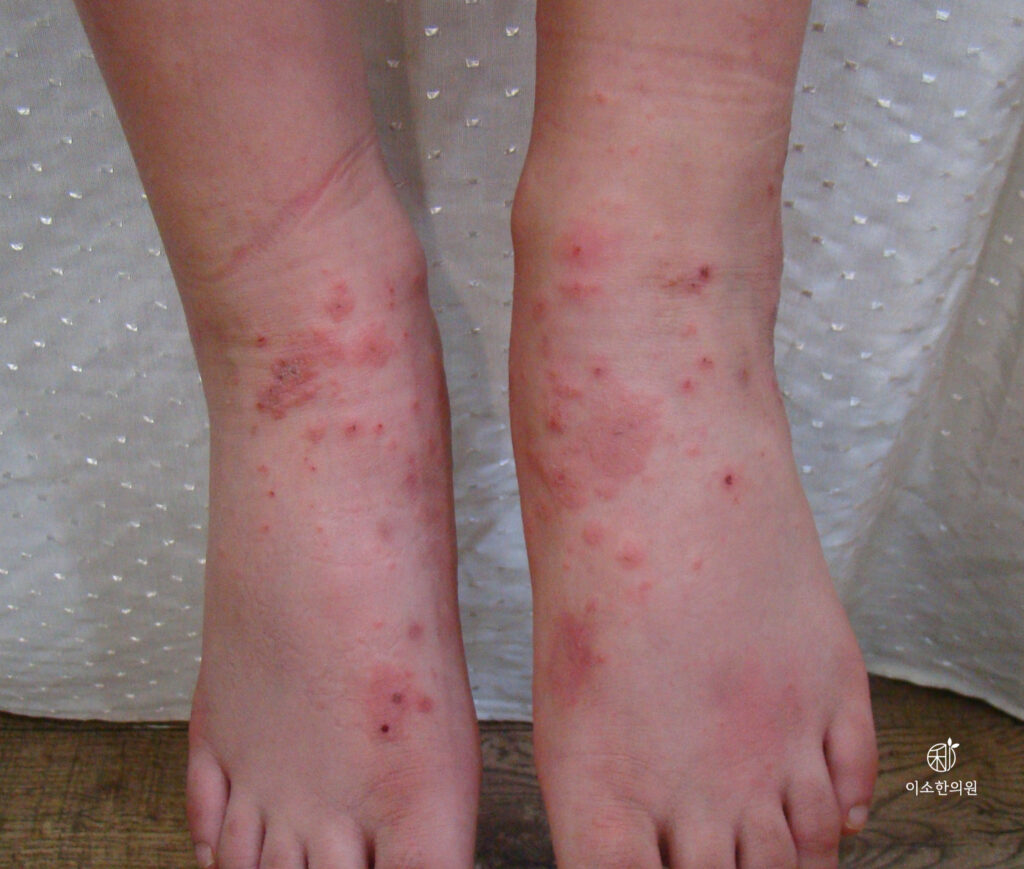 이렇게 여러 가지 습진의 양상이 있는데 공통된 증상은 피부염으로 인한 ‘가려움’일 것입니다. 가려워서 긁게 되고 긁는 부위에 2차 감염이 생기면서 염증이 심해지는 양상이 만성 습진으로 가는 전형적인 양상입니다.