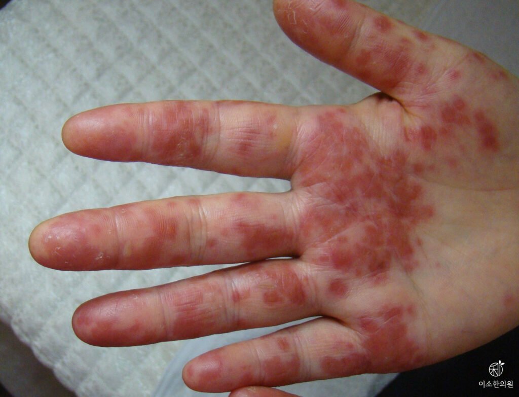 또 흔한 습진 중에는 한포진도 있습니다. 손발바닥의 표피에 수포가 생기고 가렵고 손발바닥의 열감이 생기는 피부 질환입니다.