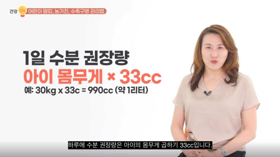 하루에 수분 권장량은 아이의 몸무게 곱하기 33cc입니다. 예를 들어 30kg인 아이가 하루 적어도 990cc, 약 1리터의 물은 마셔야 하는 겁니다. 간혹 아이가 맹물 먹기를 힘들어한다고 보리차 많이 먹이기도 합니다.