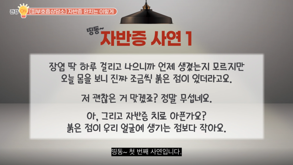 띵동~ 첫 번째 사연입니다. “장염 딱 하루 걸리고 나으니까 언제 생겼는지 모르지만 오늘 몸을 보니까 진짜 조금씩 조금씩 붉은 점이 있더라고요. 저 괜찮은 거 맞겠죠? 정말 무섭네요. 아, 그리고 자반증 치료 아픈가요? 붉은 점이 우리 얼굴에 생기는 점보다 작아요.”