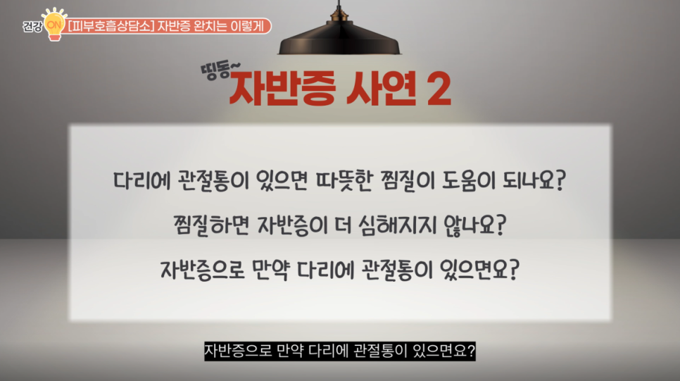띵동~ 두 번째 사연입니다. “다리에 관절통이 있으면 따뜻한 찜질이 도움이 되나요? 찜질하면 자반증이 더 심해지지 않나요? 자반증으로 만약 다리에 관절통이 있으면요?”
