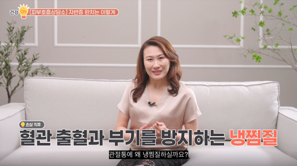 “발목이나 무릎, 종아리, 허벅지 같은 관절통 근육 부위에 따뜻한 물주머니 이용해서 찜질해 주셔야 출혈 부위가 빨리 흡수돼서 관절 부종도 가라앉고 통증도 호전됩니다.”