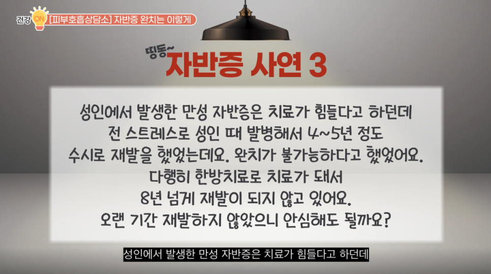 띵동~ 세 번째 사연입니다. “정보 감사합니다. 성인에서 발생한 만성자반증은 치료가 힘들다고 하던데 전 스트레스로 성인 때 발병해서 4~5년 정도 수시로 재발을 했었는데요. 완치가 불가능하다고 했었어요. 다행히 한방치료로 치료가 돼서 8년 넘게 재발이 되지 않고 있어요. 오랜 기간 재발하지 않았으니 안심해도 될까요?”