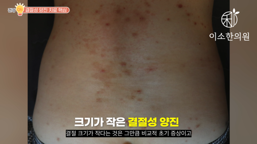 결절이 좁쌀에서 아주 작은 쌀알 정도로 작다면 그래도 치료 예후가 좋고 치료 기간이 짧다고 생각하시면 됩니다. 반면 결절 개수는 적더라도 결절이 많이 딱딱하고 크다면 그만큼 많이 긁고 자극을 가했고 오래되었다는 이야기입니다. 따라서 결절성 양진, 결절 크기가 최대한 작을 때 올바른 치료를 해야겠습니다.