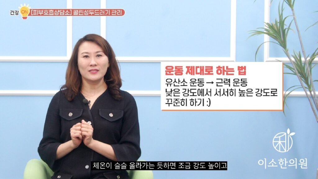 “콜린성 두드러기 환자분들은 운동을 제대로 하셔야 하고 물도 많이 드셔야 하고 보습제도 잘 바르셔서 피부가 건조하지 않게 하셔야 합니다.”