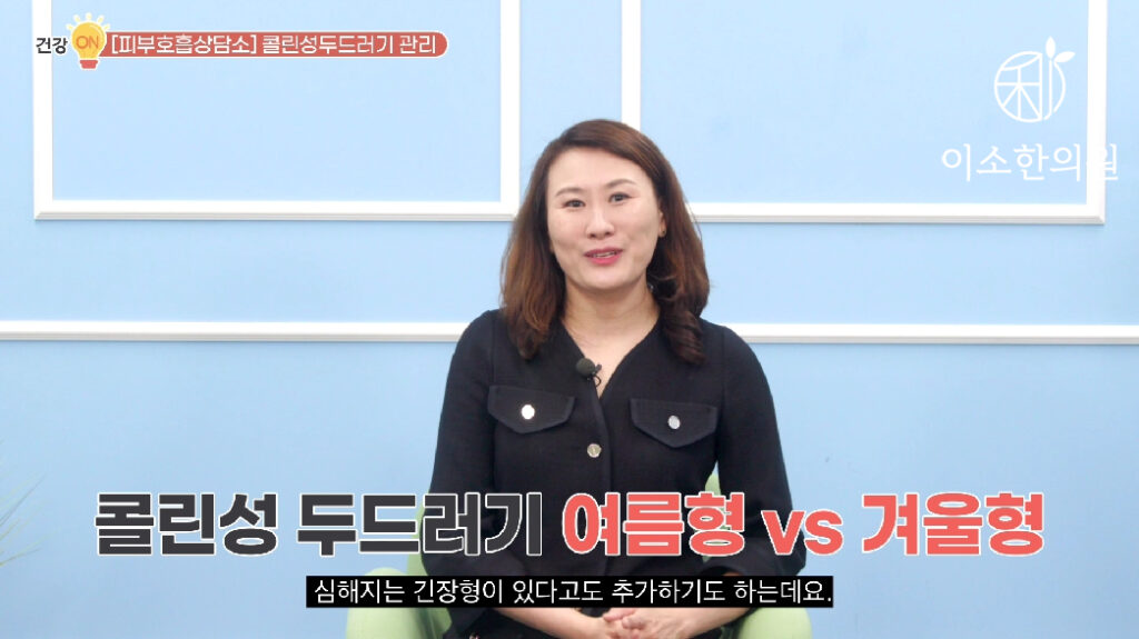 근데 두드러기는 워낙 다양한 형태나 기전이라서 땀이 날 때 땀 자체가 두드러기 반응을 유발해서 생기는 경우도 있습니다. 땀에 대한 자가면역반응이라고 이야기하는데 이런 케이스는 당연히 땀이 많이 나는 계절에 두드러기가 심해질 수 있습니다. 여름에 더 심해질 수 있어서 보통 여름형 콜린이라고 많이 이야기합니다.