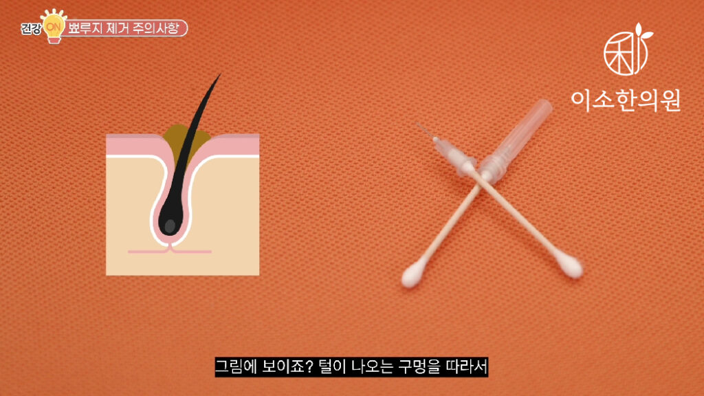 폐쇄 면포나 화농성 여드름은 피부를 개구 과정이 아주 중요합니다. 그림에서 보이시듯 털이 나오는 구멍을 따라 니들을 찔러서 구멍을 뚫어줍니다. 그래야만 각질층 아래에 있는 피지가 제대로 나올 수 있습니다.