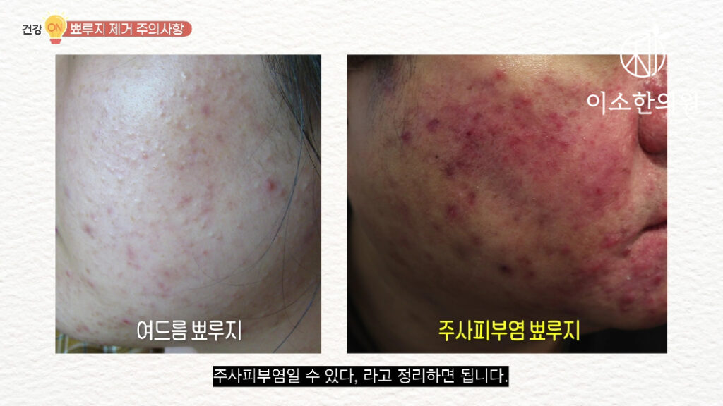 주사피부염의 뾰루지는 충혈과 염증으로 피부 장벽이 손상되어서 수포성 구진이 생기거나 원래 정상 피부에도 있는 모낭충이 증식을 합니다. 그리고 피부 장벽이 약해진 틈을 타서 모낭염이 생기는 것이기 때문에 깨끗하지 못한 손으로 자꾸 만진다거나 압출을 하면 염증이 더 심해집니다. 주사피부염 뾰루지는 만지지 않는 것이 좋습니다.