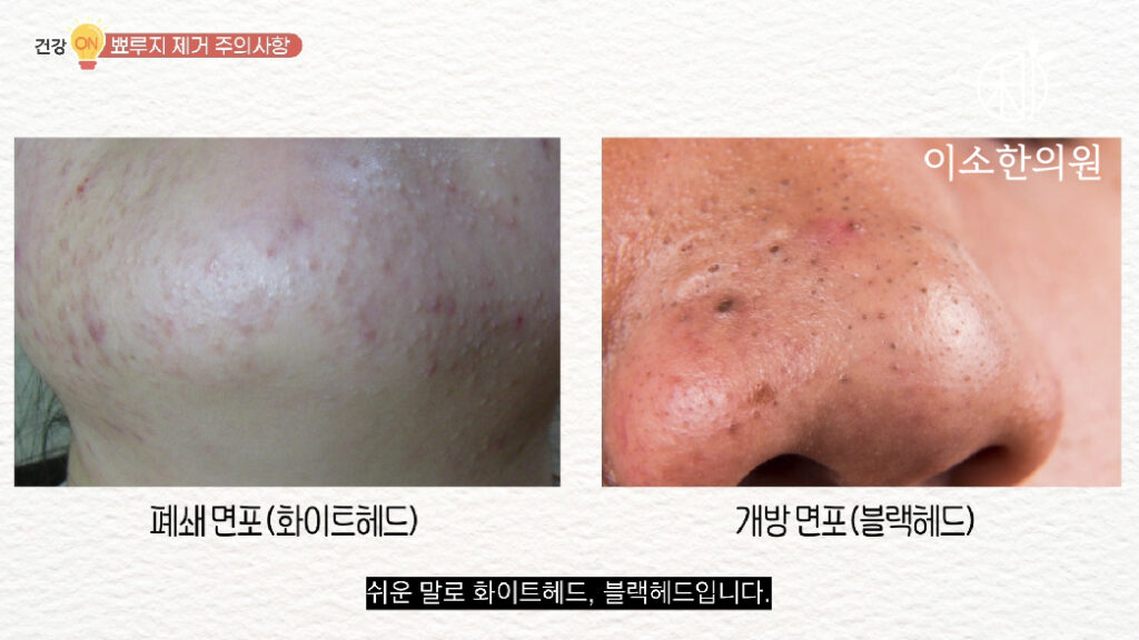 면포, 좁쌀 여드름에는 폐쇄 면포와 개방 면포가 있는데 쉬운 말로 화이트헤드, 블랙헤드입니다. 화이트헤드는 피지가 모공을 막고 각질이 덮여있는 형태로 하얗게 보이고 블랙헤드는 피지가 산화돼서 깨가 박힌 것처럼 검게 보입니다. 당연히 블랙헤드가 제거하기 더 쉽습니다. 압축기로 꼭 눌러서 피지를 쏙 제거해 주시거나 면봉 2개로 꼭 짜주면 됩니다.