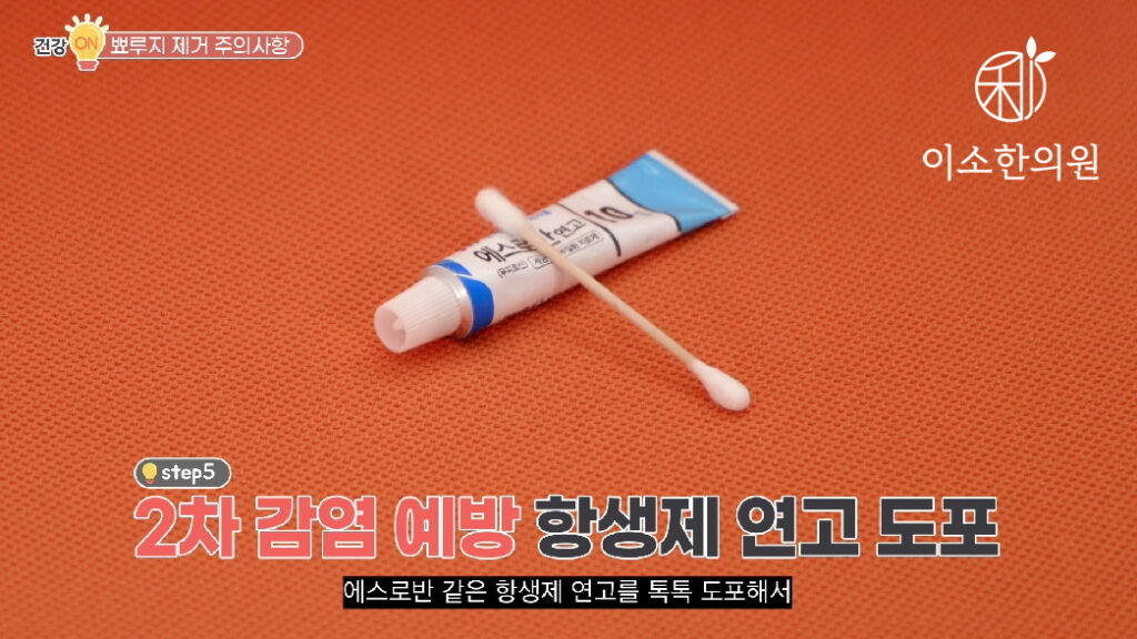 마지막으로 깨끗한 거즈로 피지나 농을 닦아 내고 알코올 솜으로 닦아냅니다. 그리고 1~2일 정도는 세안 후에 에스로반 같은 항생제 연고를 톡톡 도포해서 2차 감염이 나지 않도록 하는 것도 좋습니다.