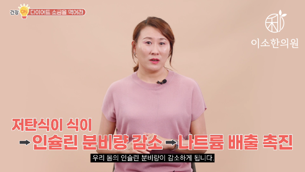 그런데 저탄수화물 식이를 해서 우리 몸의 인슐린 분비량이 감소하면 인슐린이 감소하면서 체내에서 나트륨 배출을 촉진시킵니다. 몸 안에 염분이 빠져 나가는 거죠.