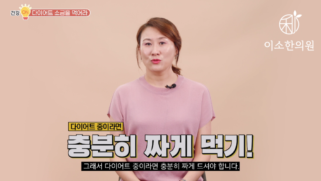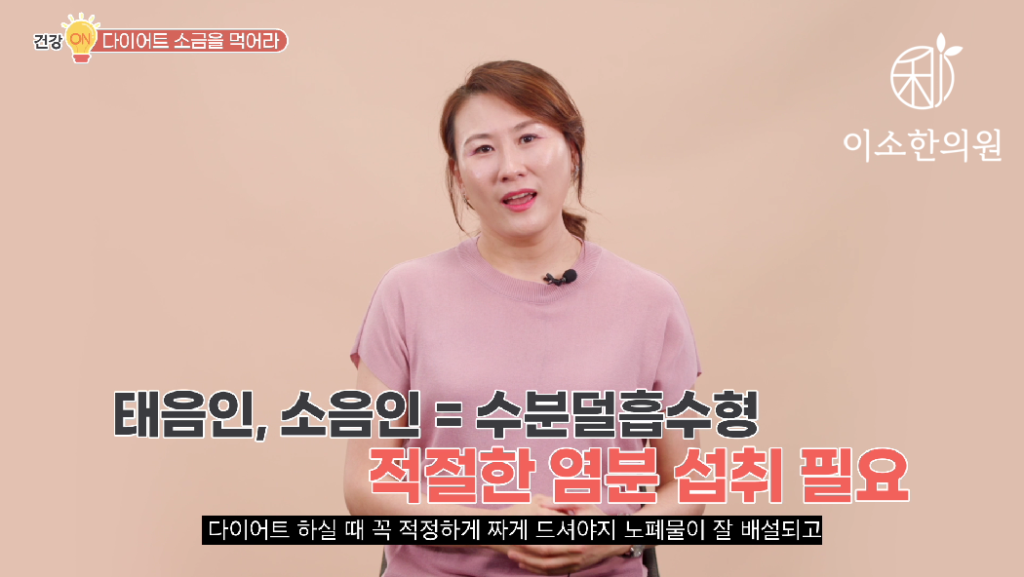 우리나라 인구의 60~70% 이상인 태음인 소음인들은 수분덜흡수형이기 때문에 다이어트 하실 때 꼭 짜게 드셔야지 노폐물 배설 잘되고 오히려 덜 붓는 몸이 될 수 있다는 것 유의 하셔야 합니다. 다이어트 할 때 소금 꼭 충분히 퍼 드시는 것 기억하세요.
