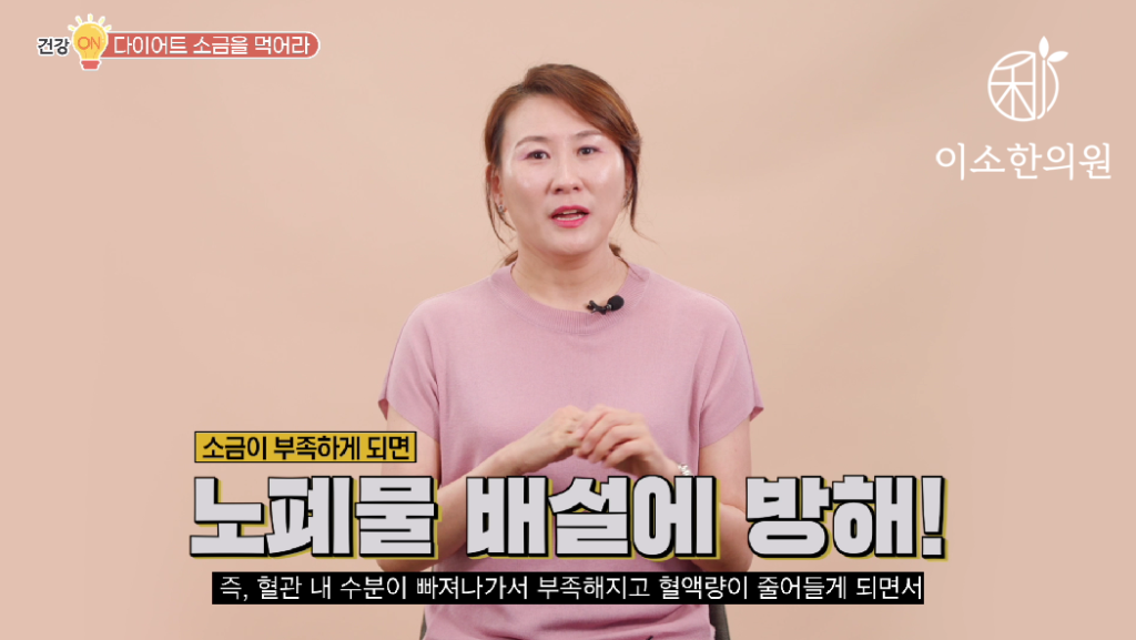 몸 안에 혈류 순환, 노폐물 배출이 잘되어야만 건강해지는 것 기본이죠. 물을 마시면 적정량의 수분이 혈관 내로 들어와서 혈류 순환이 되어야 합니다. 그런데 소금이 부족하면 물이 몸에서 빠져나가 혈관 내 수분이 부족해지고 혈액량이 줄어들어서 노폐물 배설이 방해됩니다. 혈관 속에 지방이 정체 될 수도 있고 비만의 적인 중성지방도 증가될 수 있습니다.