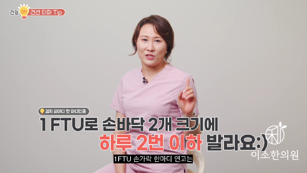 항상 연고의 사용 용량은 정확한 기간, 용량이 중요하다고 말씀 드렸습니다. 1FTU 손가락 한마디 연고는 손바닥 2개, 하루 2번 이하 꼭 지켜 주셔야 합니다.