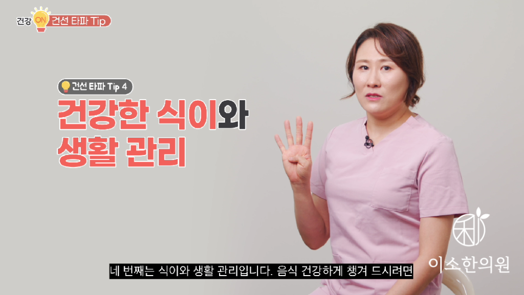 네 번째는 식이와 생활 관리입니다. 음식 건강하게 챙겨 드시려면 당연히 인스턴트, 고량후미 피하시고 제철 음식을 드시면 좋겠습니다. 더불어 본인 체질을 알고 계신다면 체질에 맞는 건강한 음식을 챙겨 드시는 것 중요합니다.