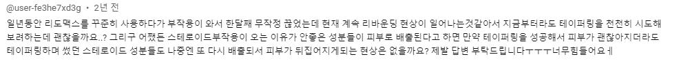 - 일 년 동안 리도맥스를 꾸준히 사용하다가 부작용이 와서 한 달째 무작정 끊었는데 현재 계속 리바운딩 현상이 일어나는 것 같아서 지금부터라도 테이퍼링을 천천히 시도해 보려 하는데 괜찮을까요? 그리고 어쨌든 스테로이드 부작용이 오는 이유가 안 좋은 성분들이 피부로 배출된다고 하면 만약 테이퍼링을 성공해서 피부가 괜찮아지더라도 테이퍼링하면 썼던 스테로이드 성분들도 나중엔 또 다시 배출 되서 피부가 뒤집어지게 되는 현상은 없을까요? 너무 힘들어요.