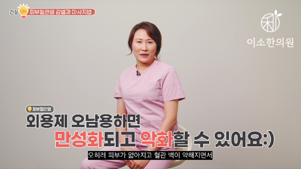 “강조하고 또 강조하는 것, 피부혈관염이 의심된다면 바르는 연고는 꼭 조심해야 합니다. 연고, 외용제를 잘못 사용 하면서 오히려 다른 피부 질환이 동반되고 악화될 수 있습니다.