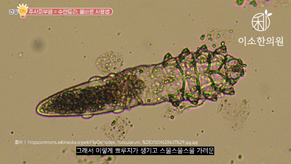 그 다음에요 수란트라 사용 후 증상이 호전되었는데 연고를 중단하니 또 다시 증상이 악화된다? 근본적으로 모낭충 증가가 일어나는 환경이 개선이 되어야만 하는 주사피부염이라 생각해야 합니다. 피부에서 비정상적인 면역반응으로 염증과 충혈이 반복되는 원인이 교정되고요 피부 장벽이 개선되어야만 모낭충의 번식이 근본적으로 해결되고 주사피부염이 치료 될 수 있습니다. 화장품이나 생활 습관 혹은 피부 면역체계의 문제 등을 종합적으로 교정하는 한의학적인 치료가 필요한 주사피부염입니다.