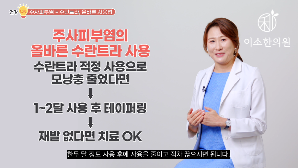 수란트라 적응증이 맞는 주사피부염에 좋은 치료방법이지만. 하지만 반복적으로 사용해야만 하는 상태라면 주사피부염의 원인을 다시 점검해야 할 것입니다. 자 그리고 증상이 호전되었다면요. 끊고 재발이 없는지 체크해야겠습니다.