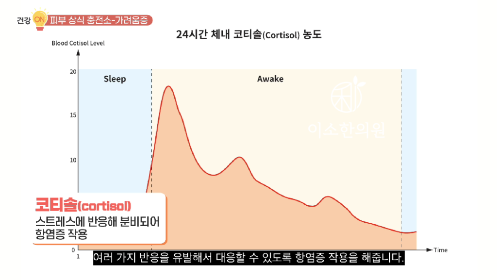 체내에서 분비되는 부신피질호르몬, 코티솔(cortisol)의 24시간 체내 농도 그래프인데요. 코티솔은요 몸에 자극, 스트레스가 가해졌을 때 여러 가지 반응을 유발해서 대응할 수 있도록 항염증 작용을 해줍니다. 그래프를 보시면요 기상 깨어 있는 시간에 분비가 증가 하다가 야간에는 감소하죠. 때문에 좀 더 염증 반응 가려움증이 심해질 수 있습니다.