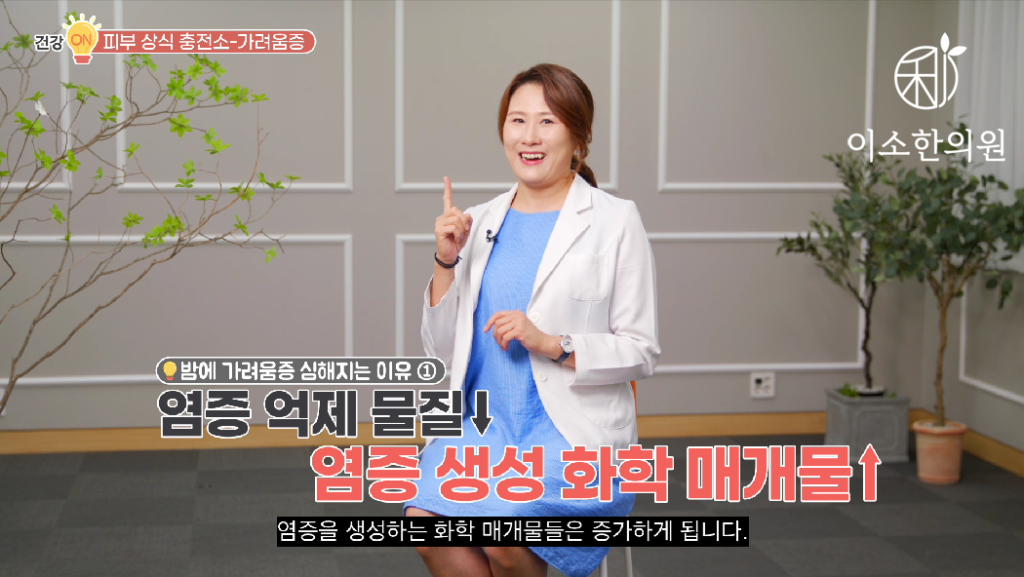 여러 가지 피부질환 때문에 진료를 받으러 오시는 환자분들이 “이상하게 밤만 되면 가려워서 죽을 것 같아요” 이런 말씀 종종 하시는데. 이상한 것 아닙니다! 당연한 반응입니다. 밤에 가려움증이 심해지는 이유는 몇 가지가 있는데. 우선 피부 질환 때문에 가렵다면요 우리 몸은 생리적으로 야간에는 염증을 억제 해주는 물질은 감소하고 염증을 생성하는 화학매개물들은 증가하게 됩니다.