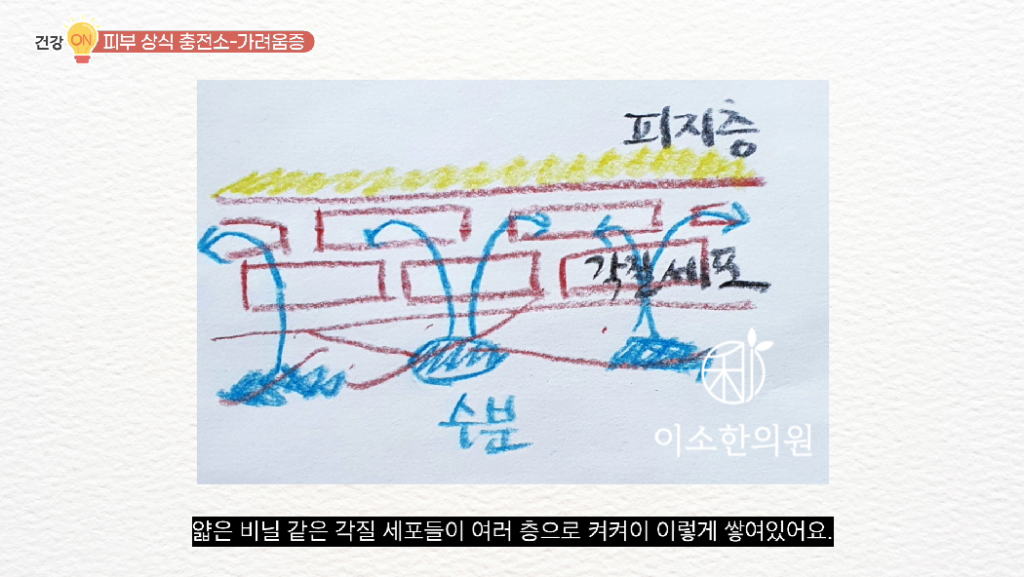 표피 가장 바깥층은요. 얇은 비닐 같은 각질세포들이 여러 층으로 켜켜이 이렇게 쌓여있어요. 그 다음에 사이사이에 세포 간 지질이 시멘트처럼 각질세포들은 이어주고 있는데. 이렇게 방어막을 쳐서 피부에서 수분이 날아가는 거, 손실을 막아줍니다. 자, 그런데 나이가 들면 표피지질에 이상이 생기면 각질층에서 코팅을 해줘서 수분이 날아가지 않도록 하는 능력이 떨어지겠죠. 그리고 노화로 진피층의 재생능력도 떨어집니다. 그러면 콜라겐. 엘라스틴 같은 탄력 조직도 줄어들고 축 처진 비닐 껍질 같은 피부가 되는 거 정상입니다. 그리고 혈류량이 줄어들면서 피부가 촉촉해지는 능력도 떨어지겠죠. 노화 때문에 피부 가려움증이 생긴다? 피부가 건조해지기 때문입니다. 병이 아닙니다. 때문에 나이 들면요 나이 들수록 보습에 꼭 더 신경 써주셔야 되고요. 보습제나 화장품도 좀 더 유화제가 있는 걸 사용해서 피부에 유막 코팅 시켜주시고 물이 덜 날아가게해주고, 그리고 평상시 수분 공급 물도 더 드시고. 건조한 계절에는 꼭 가습기 해주시면 좋겠습니다.
