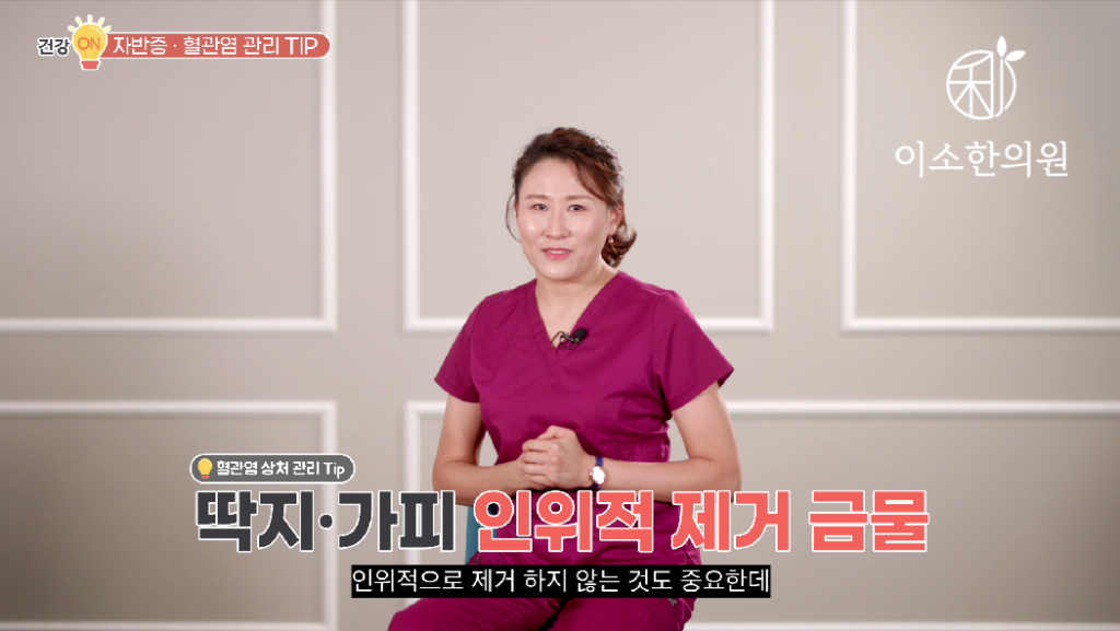 세 번째입니다. 상처 관리입니다. 최근에 피부혈관염으로 인한 피부 괴사나 상처 궤양이 심해서 절뚝거리면서 진료실로 들어오시는 분들의 공통된 특징은 상처 관리가 제대로 되지 않아서였습니다. 외과에서 소독 하고 상처 관리 하고 항생제 복용도 하는데 상처 안 낫고 점점점점 깊어지면서 뭐 성형외과 대학병원 가셔서 진료도 받고 피부 이식도 해야 된다, 뭐 이러말 듣고 오시죠. 걱정이 돼서요. 혈관염 피부 상처 초기에 관리만 제대로 되어도 악화는 막을 수 있습니다. 우선 만약에 상처가 생긴다면 꼭 환부에 충격이나 마찰을 방지 할 수 있는 거즈를 대주셔야 하고요. 마른 거즈를 상처부위에 덮어서 상처가 신발이나 양말이나 바닥에 닿지 않도록 보호하는 것 중요합니다. 만약 상처가 깊어서 농이나 진물이 좀 난다면 거즈를 제거 하고 드레싱을 할 때 멸균식염수를 거즈에 부어서 상처의 표피가 이렇게 달랑~ 탈락 되지 않도록 주의해야 합니다. 만약에 딱지가 앉았다면, 가피가 앉았다면 인위적으로 제거 하지 않는 것도 중요 한데 상처 자체가 혈관의 폐색으로 인해 생기는 건데 그래서 생긴 조직의 괴사인 만큼 가피를 함부로 제거하면요 상처는 아물지 않습니다. 그리고 점점 깊어지죠. 그래서 최대한 상처를 보존 하는 것이 필요 합니다. 이렇게 상처 초기 관리만 잘 하면 우선 환부가 심해지는 것은 방지할 수 있습니다. 문제는요 만약에 오랜 기간 상처재생이 이루어지지 않고 통증이 심하다면 꼭 한의학적인 치료를 통해서 혈관염을 진정시키고 혈류 순환과 피부 재생을 도모해야 합니다.
