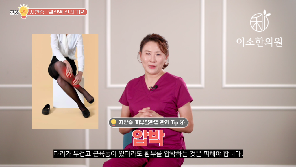 네 번째입니다. 혈관염, 망상청피반 등으로 다리색이 얼룩덜룩하고요. 다리가 무겁고 근육통이 있더라도 환부 압박하는 것은 피해야 합니다. 압박스타킹 금물입니다. 간혹 다리가 무겁고 붓고 뭐 저리다 이런 증상이 있는 망상청피반 환자들이 병원에서 하지정맥류라 진단 받고 압박스타킹 권유 받기도 하는데요. 안됩니다. 우선 하지정맥류와 망상청피반은 전혀 다른 질환이고요. 하지정맥류는 혈관의 탄력이 저하 돼서 압박스타킹으로 이렇게 조여 주는 것이 도움이 될 수 있지만 혈관염은요. 혈관벽이 손상 되어서 출혈이 있는 거죠. 그런데 압박을 하면 어떻게 될까요? 약해진 혈관벽이 더 터지겠죠? 그리고 압박스타킹으로 압박한 이외의 부위에 출혈반이 증가한다거나 저녁에 스타킹을 벗고 난 후에 출혈반이 늘어날 수 있습니다.