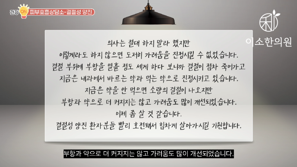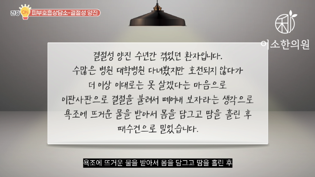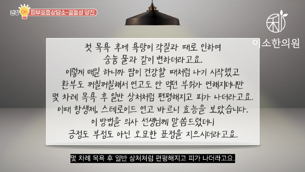 이분이 이판사판으로 목욕탕에서 뜨거운 물로 몸을 불리고 때를 밀어서 물이 뿌옇게 되었다는 표현이 아마도 오랜 기간 연고 사용과 피부 질환 반복으로 각질층이 두꺼워져있었는데 탈락되니까 연고 흡수가 좀 쉬워져서 증상이 컨트롤되더라고 이해해야 할 듯 합니다.