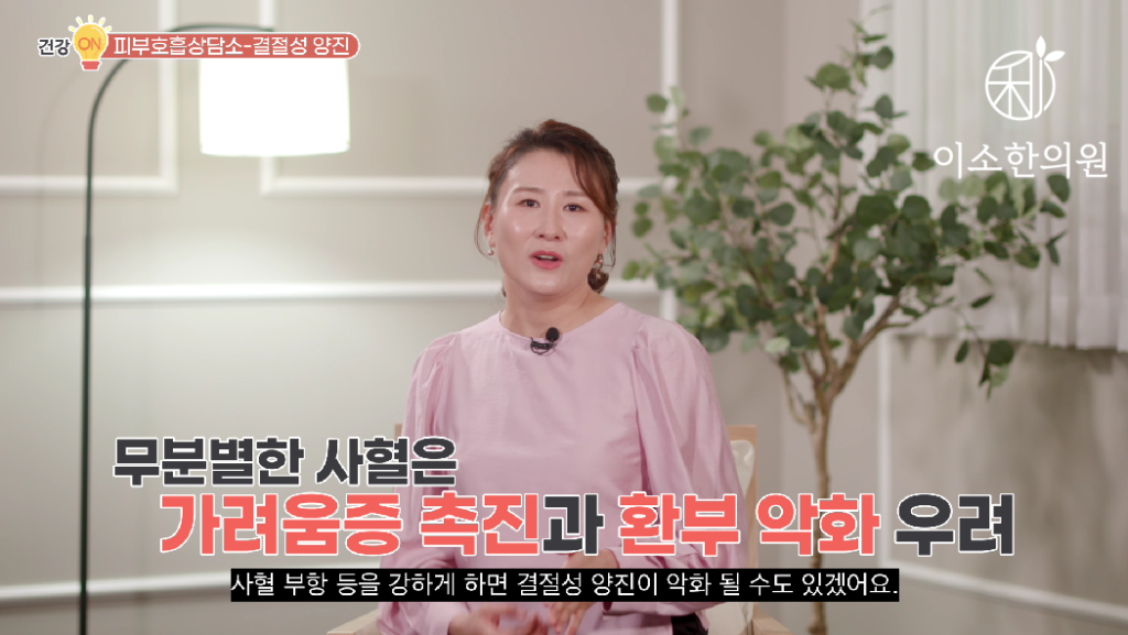 또 물론 이 분께는 좋은 방법이겠지만 피부 장벽상태에 따라서, 염증 정도에 따라 사혈 부항 등을 강하게 하면서 결절성 양진이 악화 될 수도 있겠어요. 결절성양진에 가장 중요한 것은 긁지 않기 인데 이유는 긁는 자극이 가려움 유발 물질을 촉진 시켜서 가려움증이 더 심해지기도 하고요 또 염증이 반복되면서 피부가 섬유화 되어 결절이 커지기도 하기 때문에 혹시라도 무분별한 사혈 자극이 환부를 악화시킬 수도 있겠다, 주의 관찰해야 합니다.