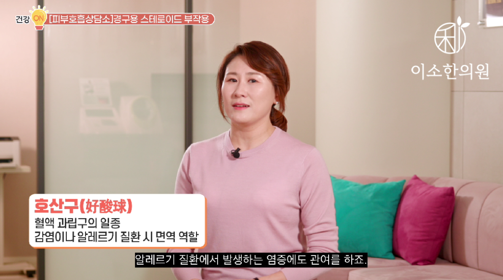 이런 사연 주셨는데요. 간혹 진료실에 찾아오시는 가장 안타까운 케이스입니다. 우선 호산구라는 것부터 이야기 하자면 혈액 과립구의 일종으로 감염이나 알레르기 질환이 있을 때 면역기능을 담당합니다. 그래서 특정 감염에 대해 방어기능을 하거나 알레르기 질환에서 발생하는 염증에도 관여를 하죠. 즉 호산구가 많이 높다는 것은요 몸에 염증 반응이 과도하게 일어나고 있다는 신호겠습니다.