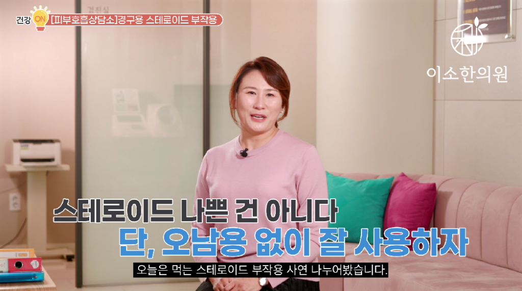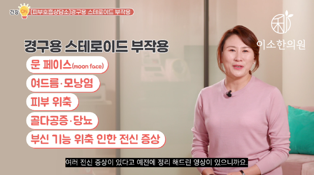 경구용 스테로이드 대표적인 부작용은 문페이스(moon face), 여드름, 모낭염, 뭐 피부 위축, 골다공증이나 당뇨, 부신기능 위축으로 인한 여러 전신증상이 있다고 예전에 정리 해드린 영상이 있으니까요 한 번 참고해보시면 좋겠습니다. 자 그렇다면 사연으로 들어가서요..